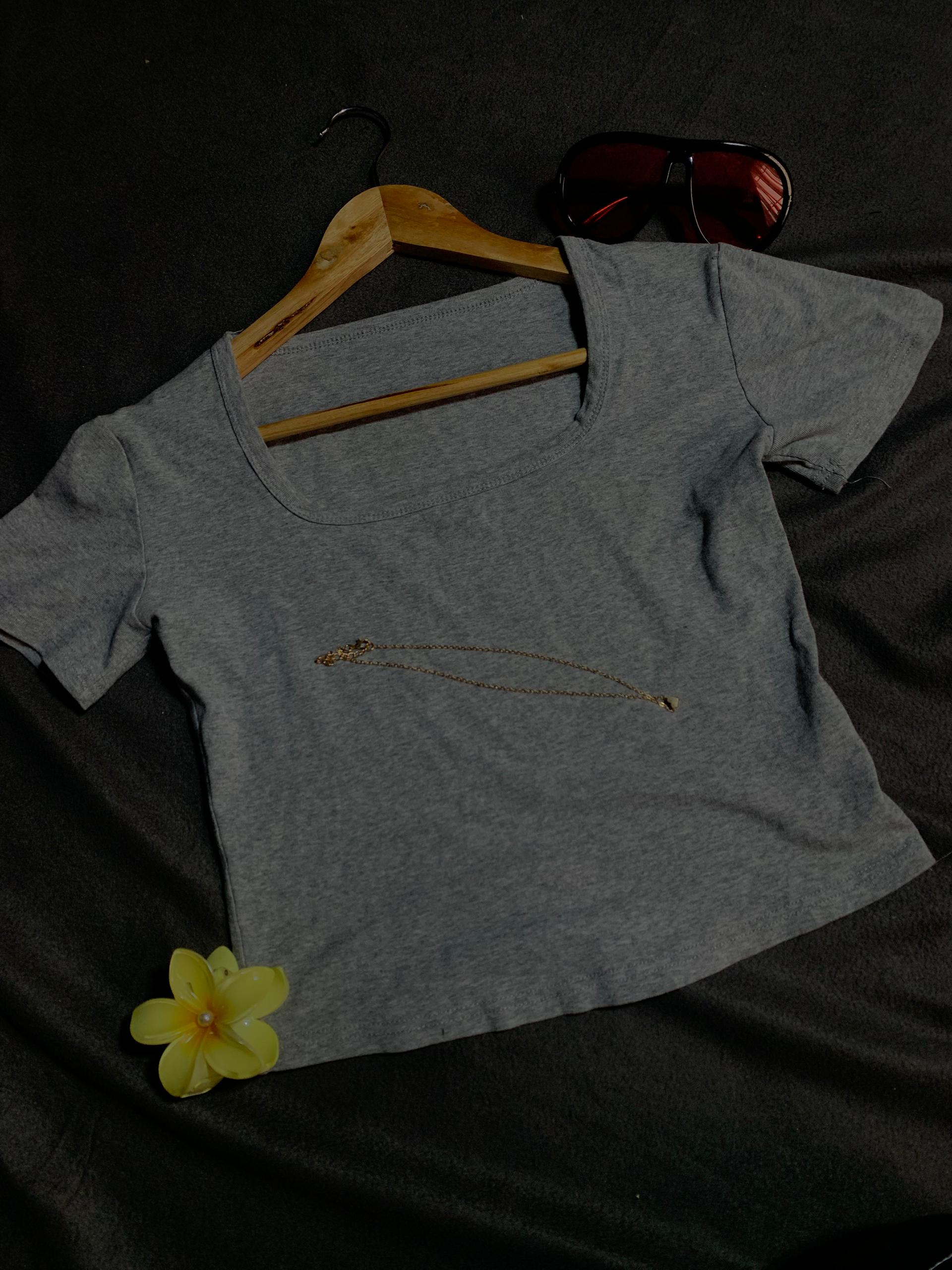 A versatile wardrobe essential crafted in soft grey fabric, designed with a simple yet stylish cropped fit. Perfect for pairing with high-waist jeans, skirts, or shorts, it offers a clean and effortless look for everyday wear